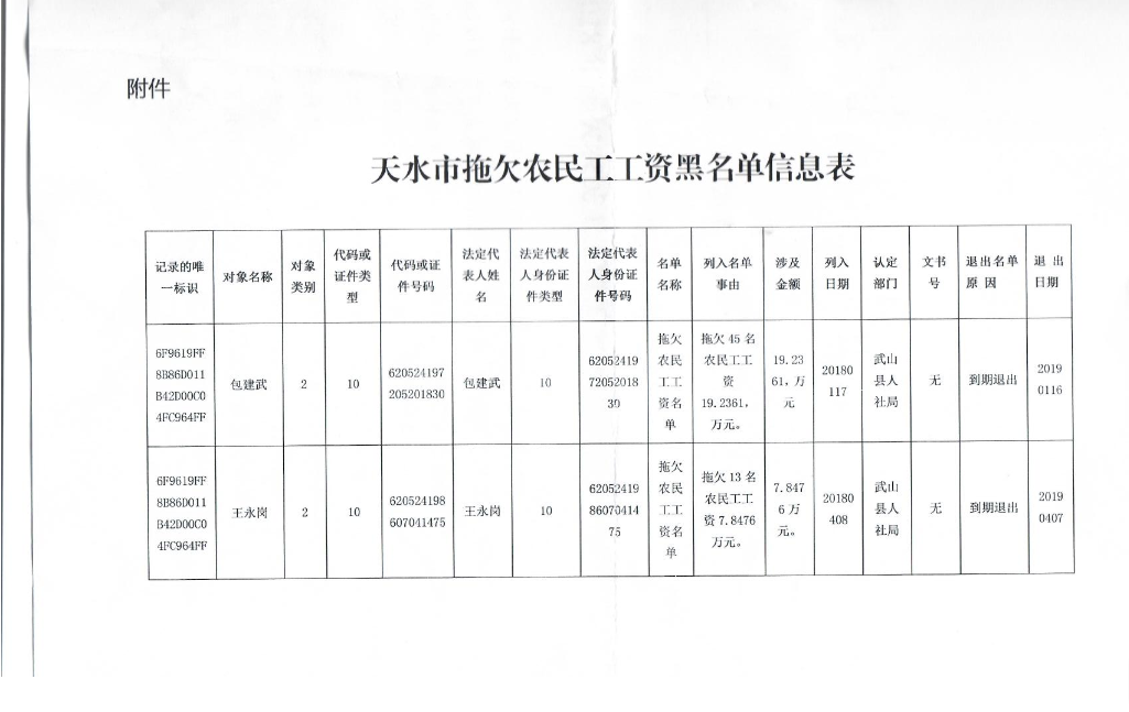 天水市拖欠农民工工资黑名单信息表