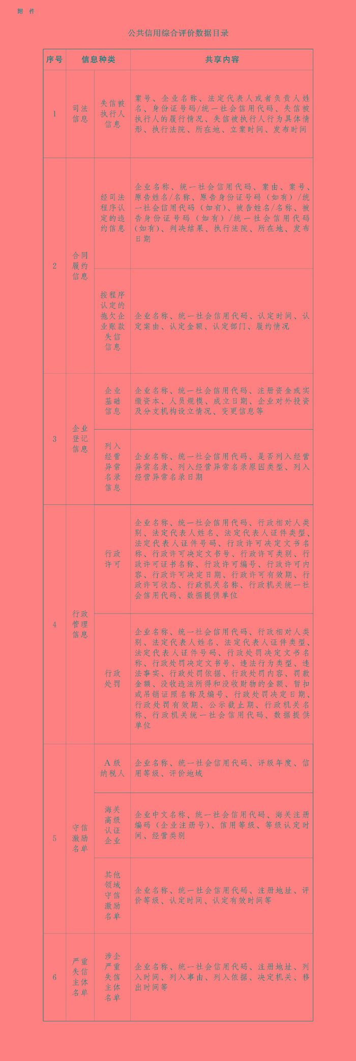 一、建立企业信用状况综合评价体系制度框架。企业信用状况综合评价主要包括公共信用评价和市场化信用评价。公共信用评价由政府部门遵循公益性原则组织开展,反映企业遵守法律法规和相关管理规定情况,主要服务政府管理。市场化信用评价由征信机构、信用评级机构、行业协会商会等第三方机构依法依规开展,反映企业参与市场活动的违约风险,主要服务融资授信、商业往来等市场活动。更好发挥公共信用评价结果在企业信用状况综合评价中的基础性作用,推动公共信用评价和市场化信用评价相互融合,逐步形成统一的企业信用状况综合评价体系。