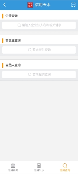 三、通过“天水市社会信用平台”微信公众号提供查询。微信搜索关注“天水市社会信用平台”官方微信公众号,点击信用查询功能,输入企业名称或统一社会信用代码查询企业信用信息(图三)。