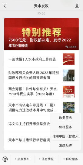 四、通过“天水发改”微信公众号提供查询。关注“天水发改”微信公众号,点击群众服务-信用中国(甘肃天水),输入企业名称查询信用信息(图四)。