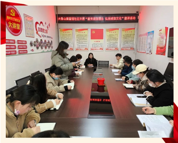 为加快推进社会信用体系建设,全面加强社区居民的诚信教育,营造人人讲诚信的良好社区氛围,大像山镇富强社区结合全国第五次经济普查工作开展“宣传诚信理念 弘扬诚信文化”诚信宣传活动,树立诚信理念,践行诚信规范。