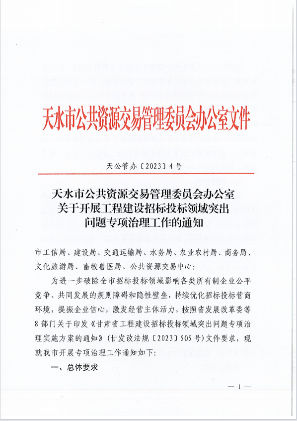 天水市公共资源交易管理委员会办公室关于开展工程建设招标投标领域突出问题专项治理工作的通知