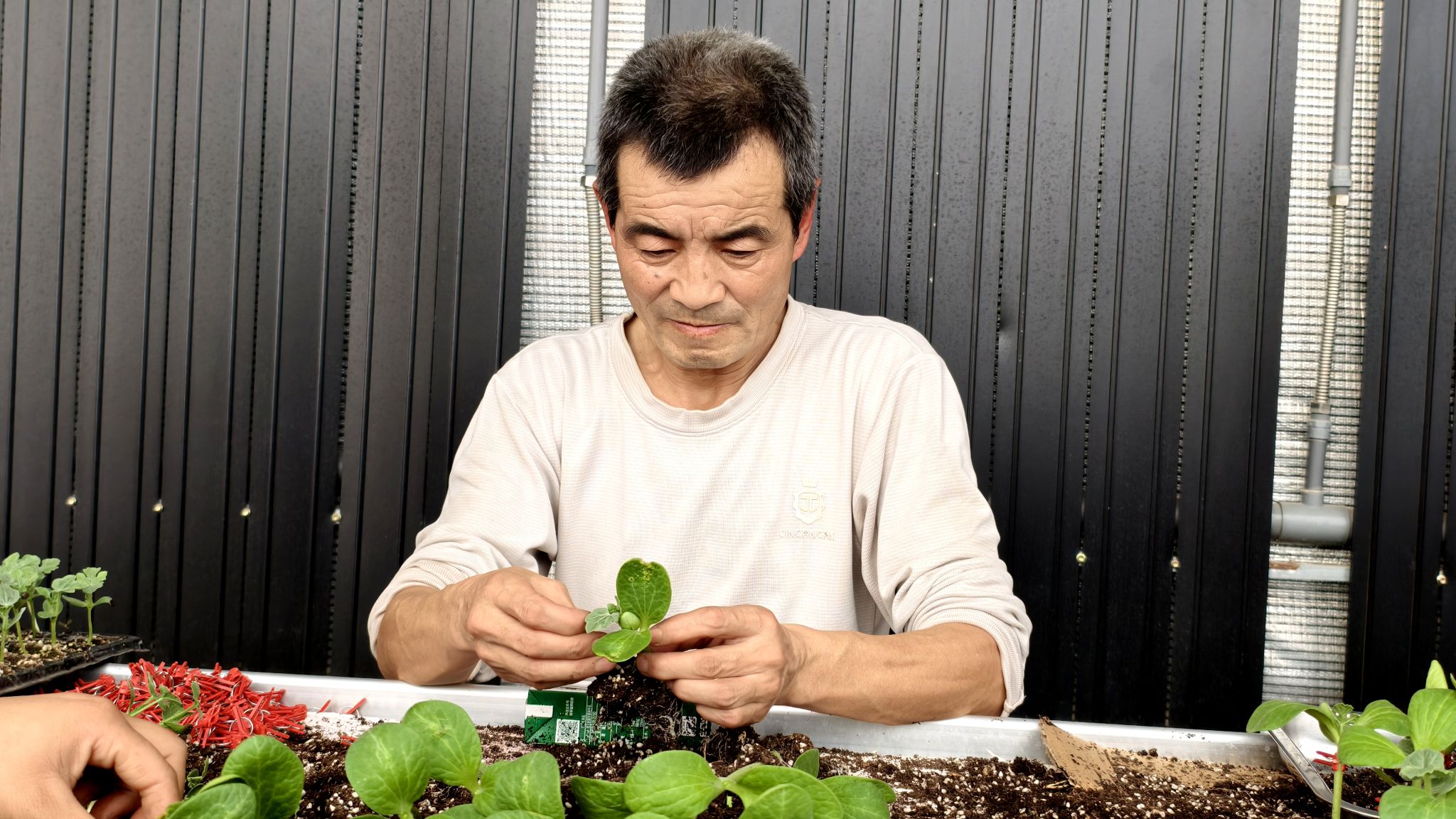 操作台上,“土专家”们将营养杯中的南瓜苗顶部切一小口,然后把西瓜苗接上再用夹子夹紧,这样一颗嫁接西瓜苗就完成了。嫁接的西瓜苗其优点是具有良好而稳定的亲和性、长势稳定、对西瓜的品质无不良影响。