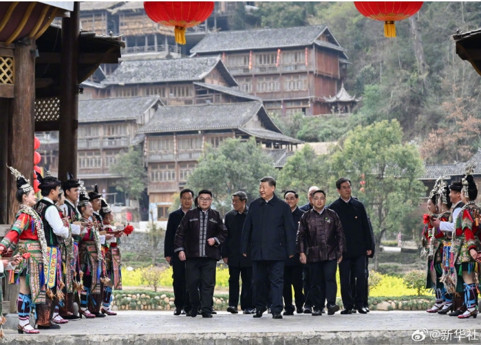 【信团鼓楼话振兴,习近平:祝你们的日子越过越红火】17日下午,习近平总书记来到贵州黎平县肇兴侗寨考察。在村寨的信团鼓楼,习近平同村干部和村民代表围坐在火塘边共话乡村全面振兴。大家你一言、我一语,争相向总书记讲述近年来的村寨变化和幸福生活。习近平高兴地说,从你们的讲述、你们的神情可以看出,村寨这些年欣欣向荣。现在旅游是一个很大的产业,乡村旅游如火如荼,民族地区要保留自己的特色文化,在文旅融合中更加彰显它的光彩。祝你们的日子越过越红火!