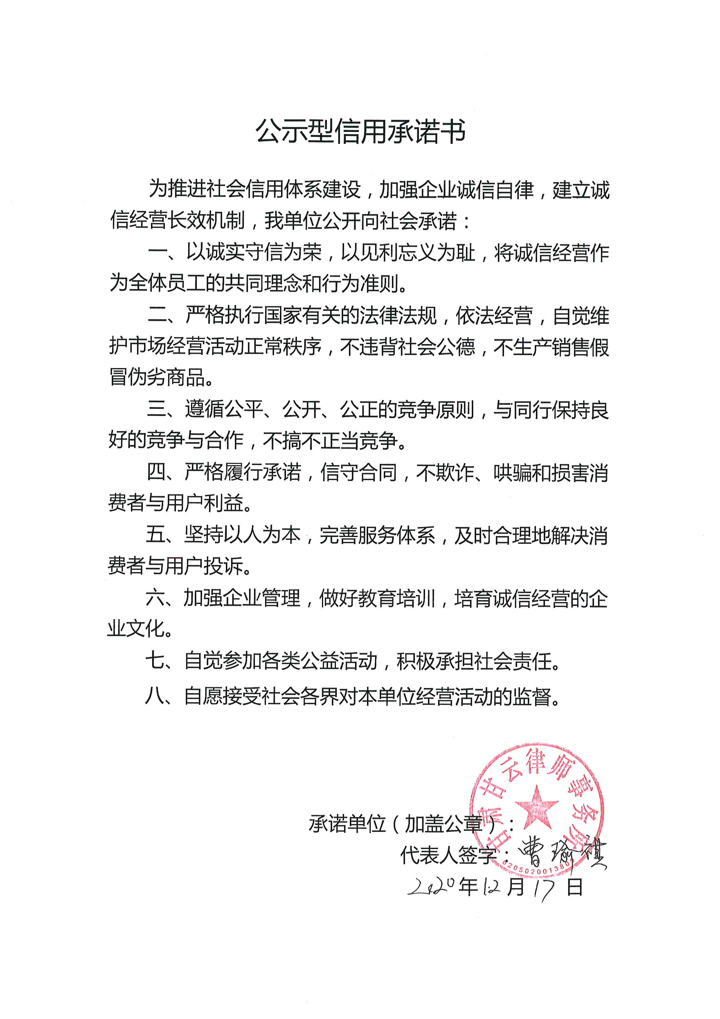 秦州区信用承诺书