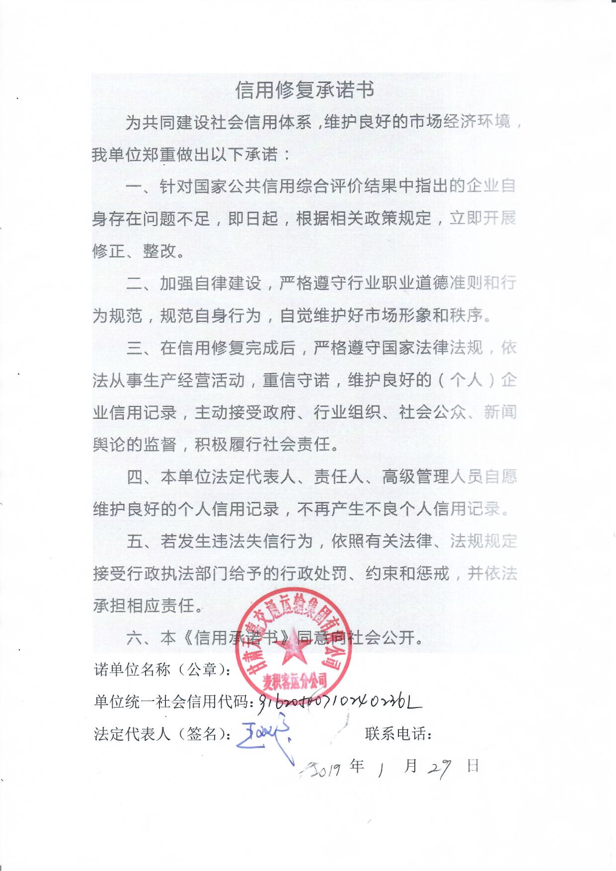 天水市武山县企业承诺书