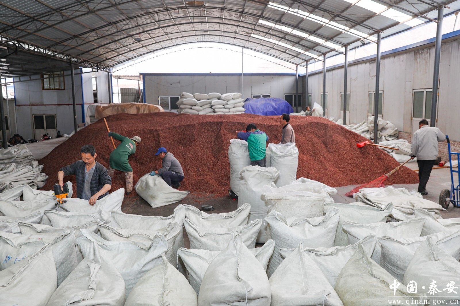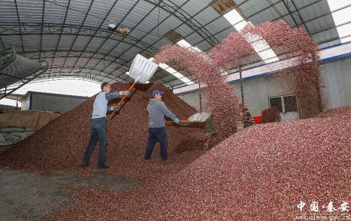 车间内,装满花椒的编织袋整齐码放,筛选、封装、装车工序有序推进。数十吨色泽艳红、颗粒饱满的花椒堆积如山,工人手持工具翻捡分选,浓郁麻香弥漫全场。